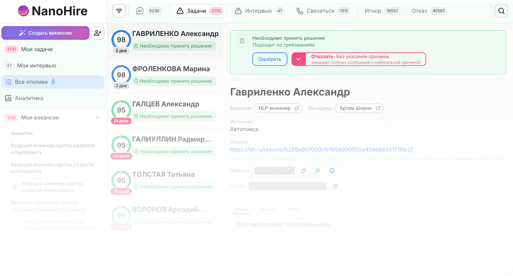 NanoHire заменяет рутину HR-специалиста: за те же деньги вы получаете ассистента, который работает без выходных, обрабатывает в 10 раз больше кандидатов и закрывает вакансии быстрее. Окупаемость - от 1 месяца, стоимость найма - в 7 раз ниже.