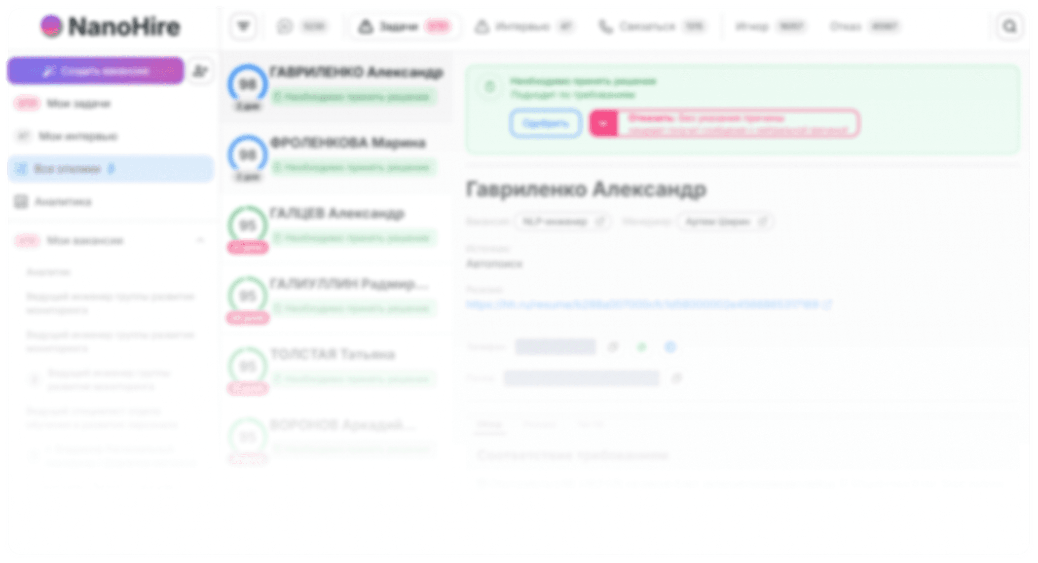 NanoHire автоматически оценивает резюме с помощью ИИ по 50+ критериям - от опыта до релевантных навыков - и с точностью 99.95% определяет, подходит ли кандидат. Это заменяет до 95% рутинной работы и экономит до 120 часов на каждую вакансию.